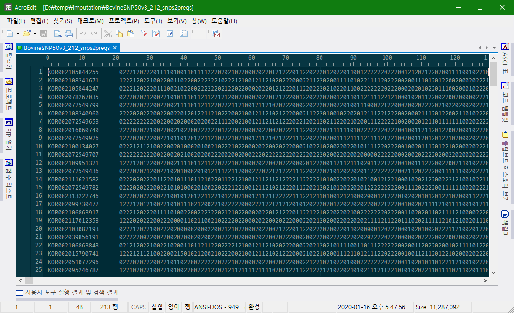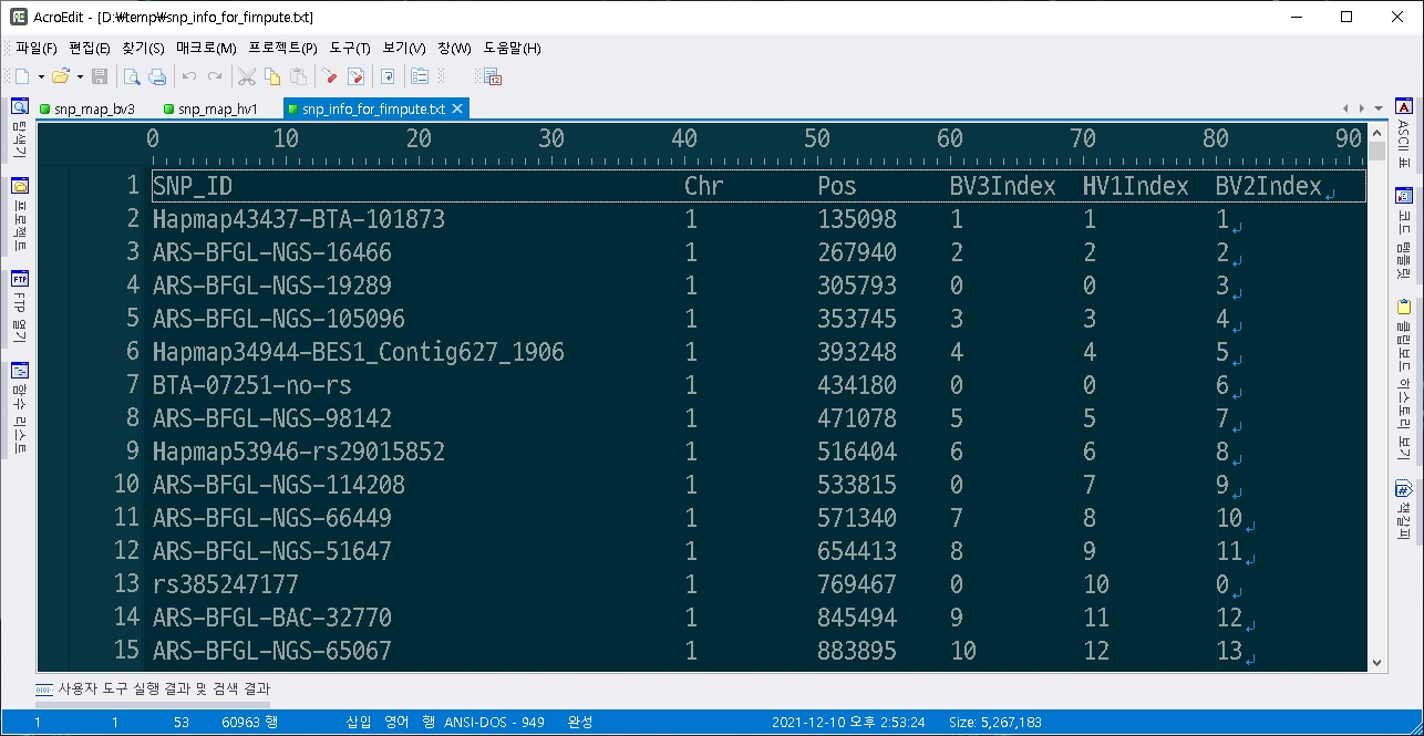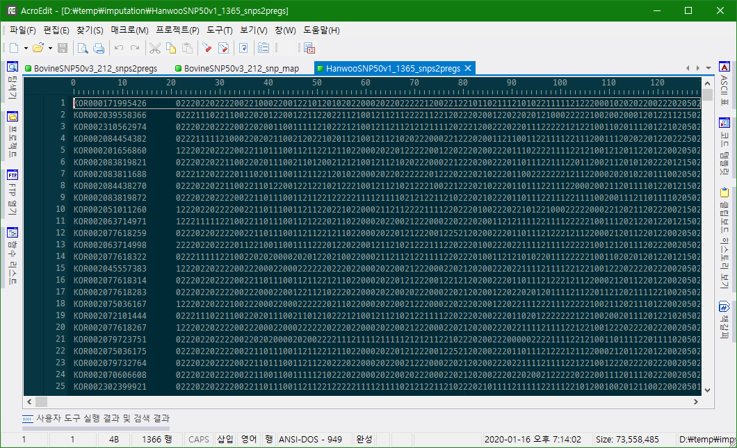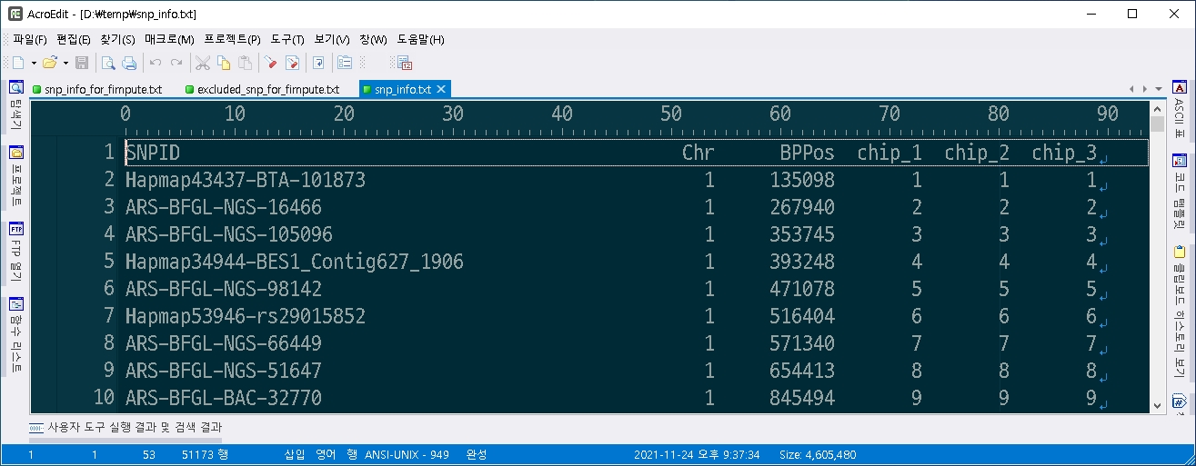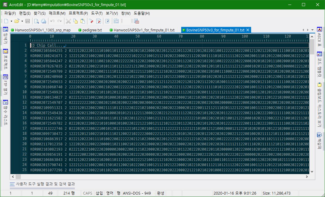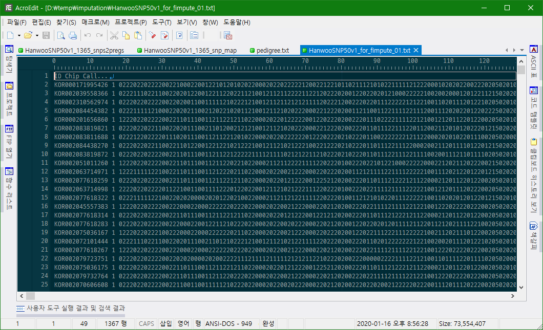 실행한 결과는 출력된 HanwooSNP50v1_for_fimpute_01.txt은 다음과 같다.