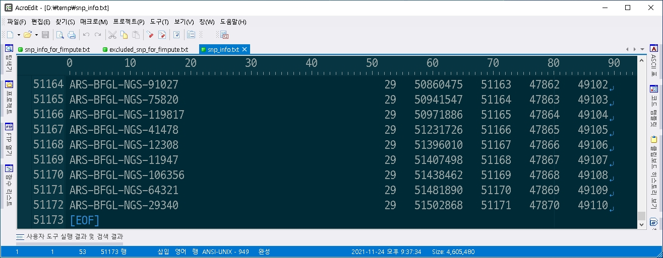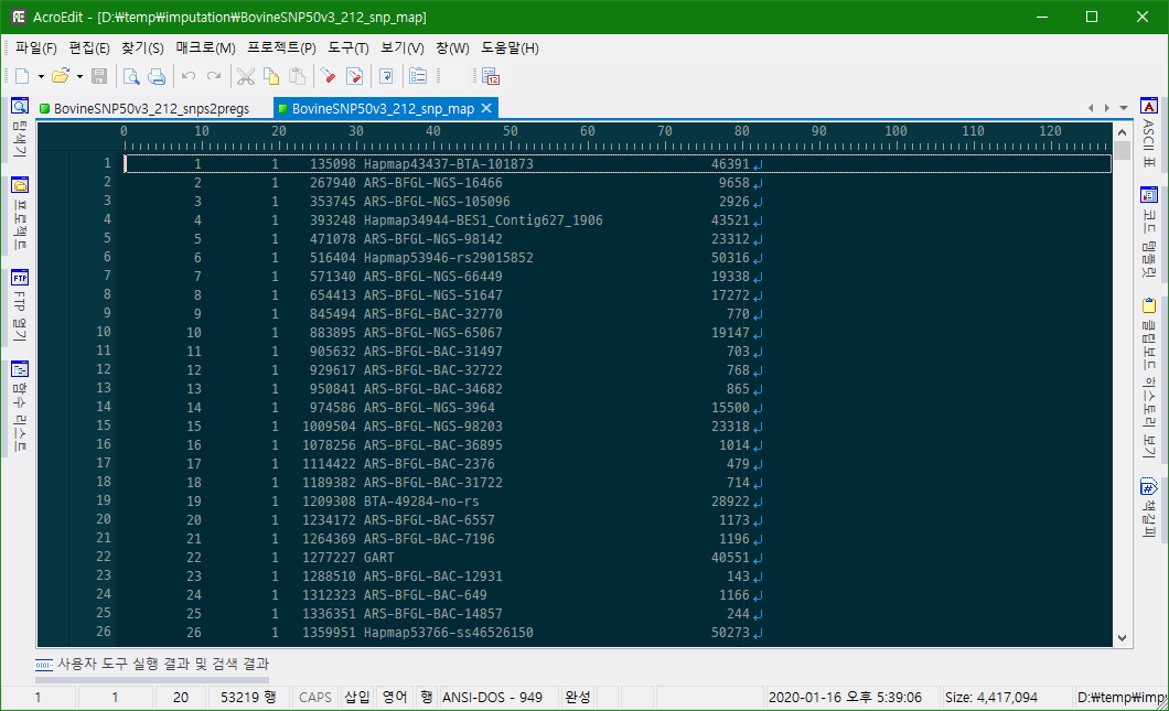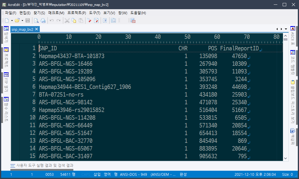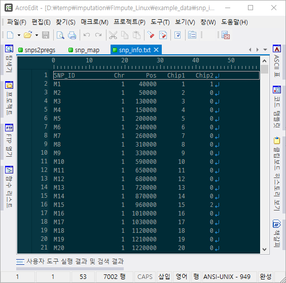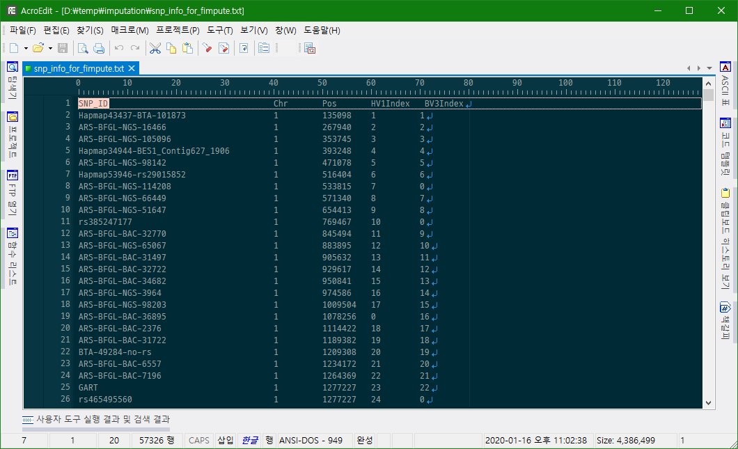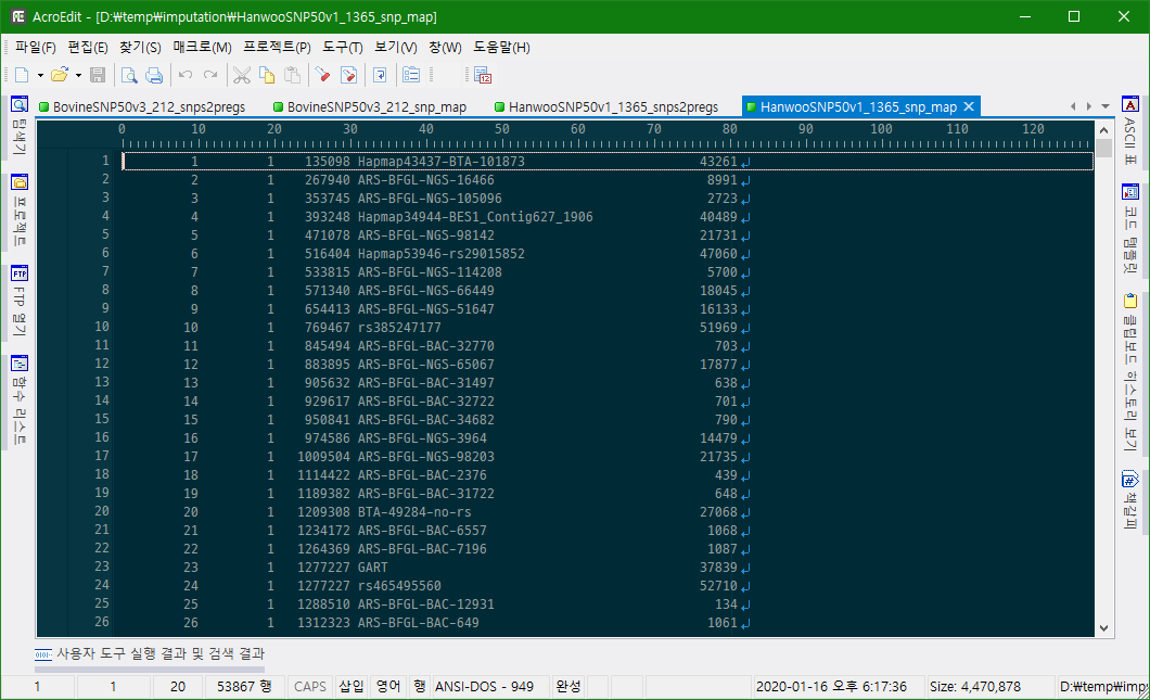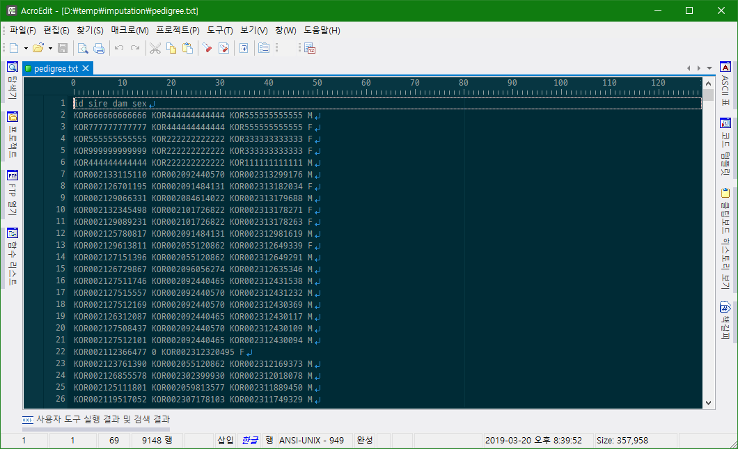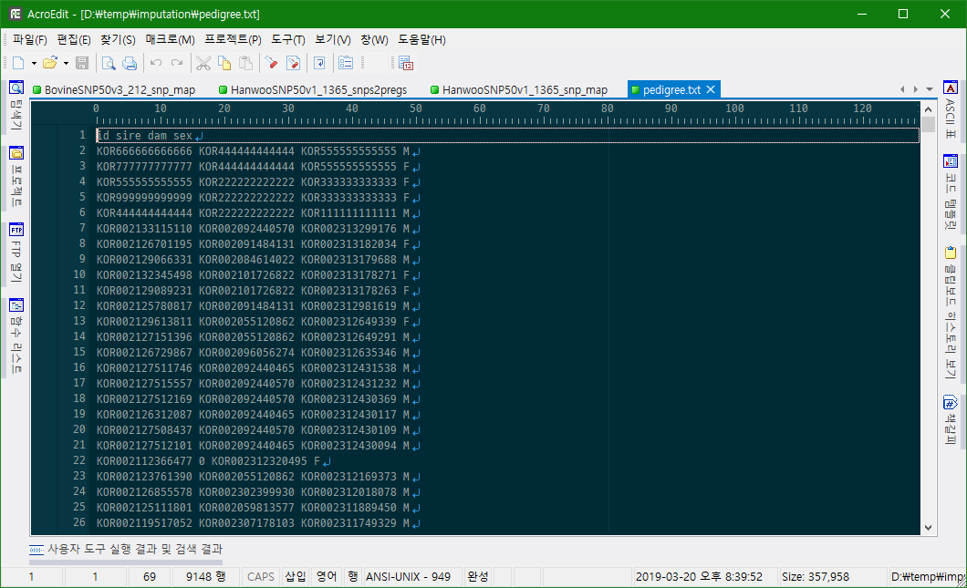 실행한 결과는 출력된 HanwooSNP50v1_for_fimpute_01.txt은 다음과 같다.