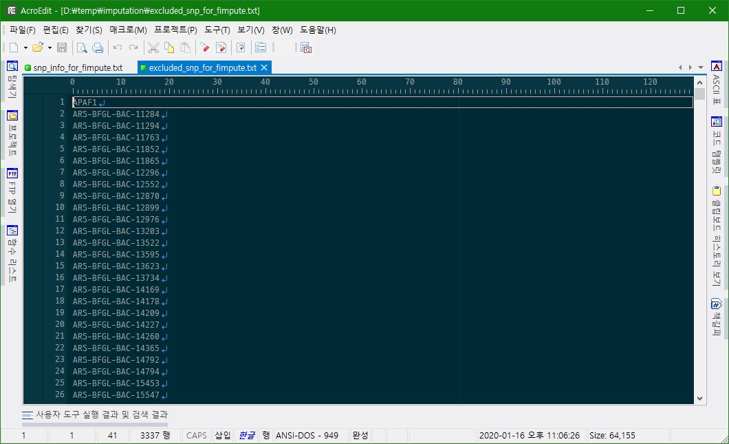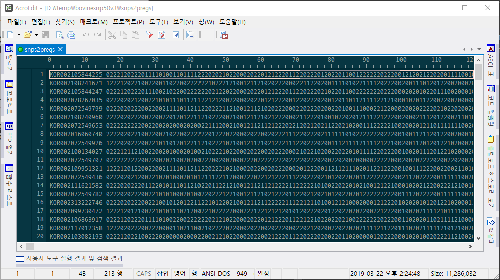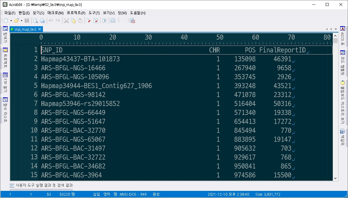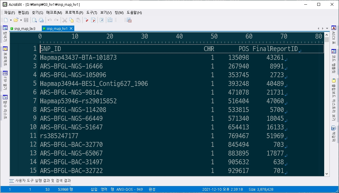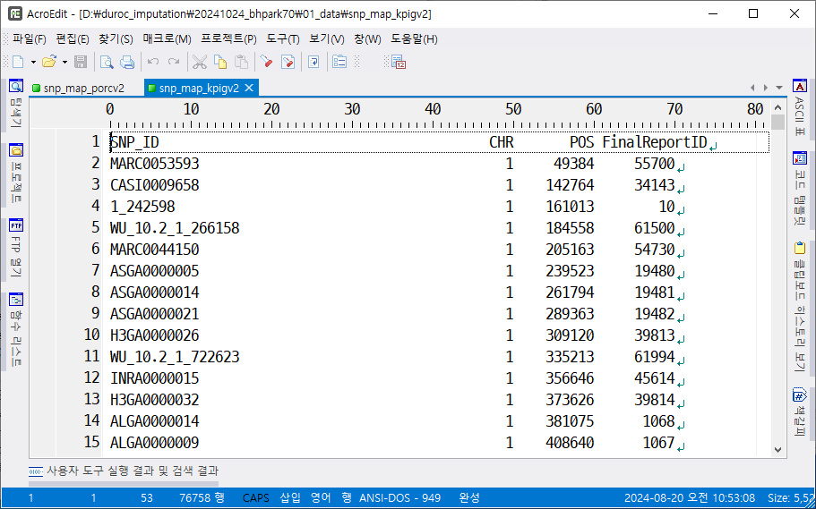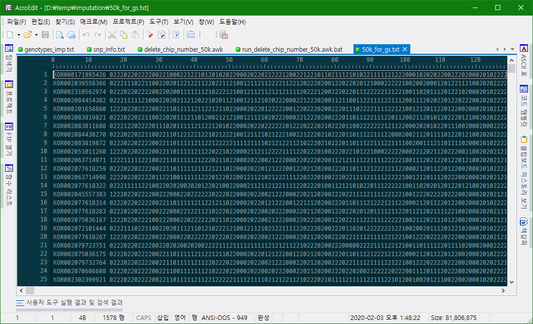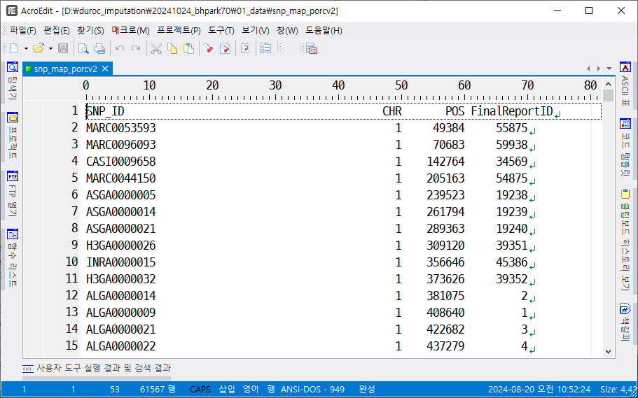 실행한 결과는 출력된 HanwooSNP50v1_for_fimpute_01.txt은 다음과 같다.