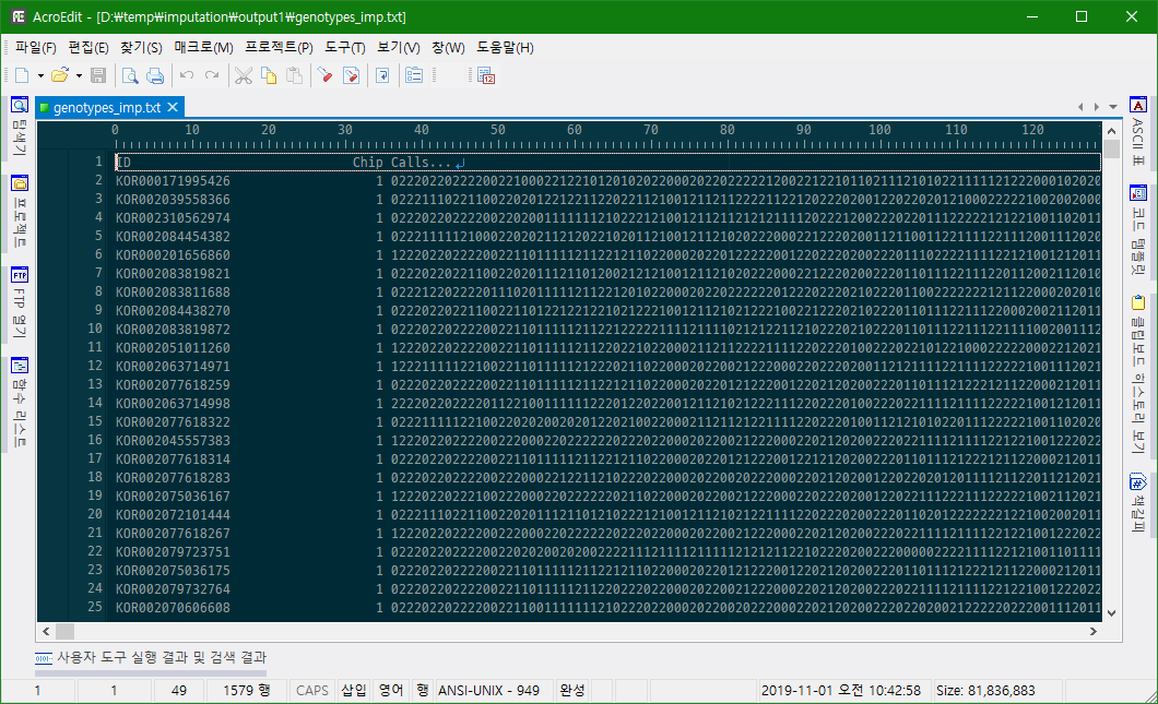 output1 폴더에 imputation된 결과를 볼 수 있다. genotypes_imp.txt 파일이다.
