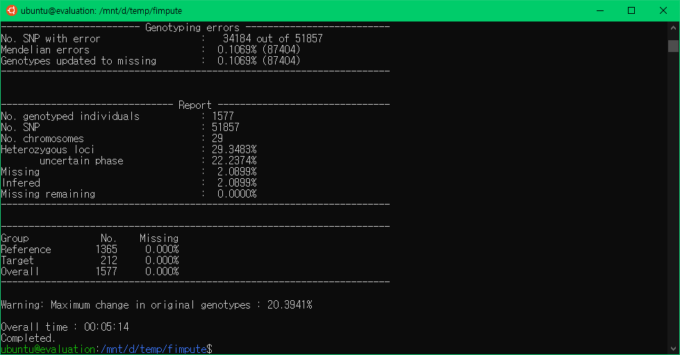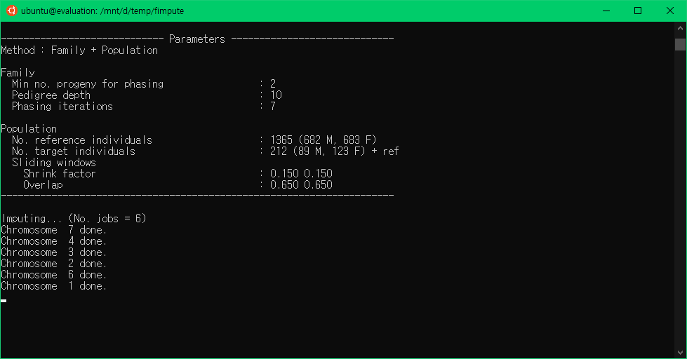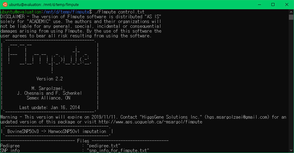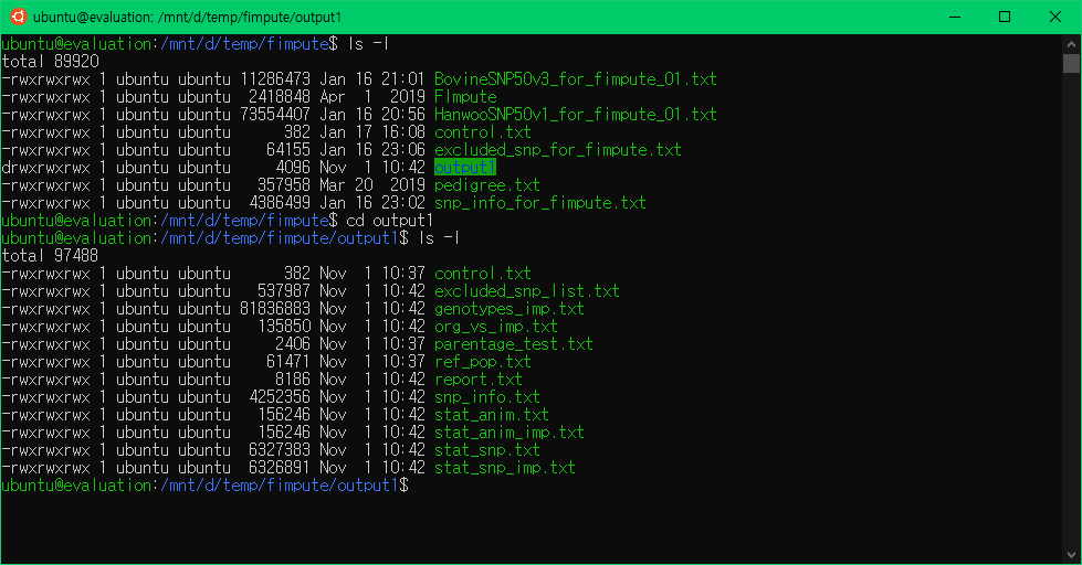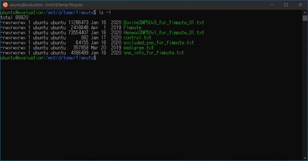 리눅스에서만 FImpute를 실행할 수 있다. 실행하기 위하여 필요한 파일을 리눅스 컴퓨터의 폴더에 복사한다. 여기서는 윈도우즈 10의 Windows Subsystem for Linux 중 Ubuntu를 설치하고 실행한 화면이다.
