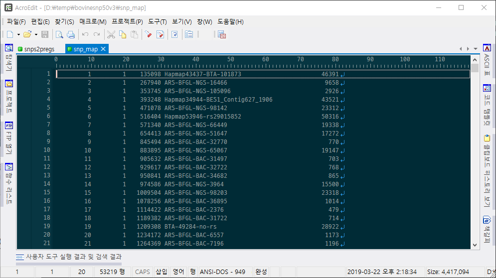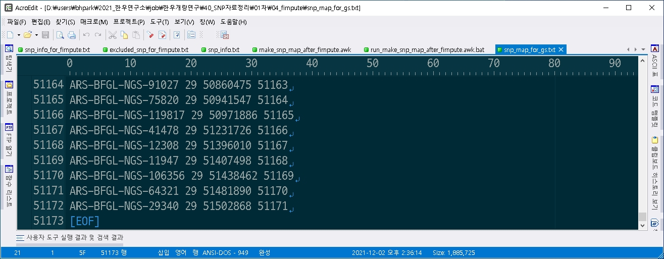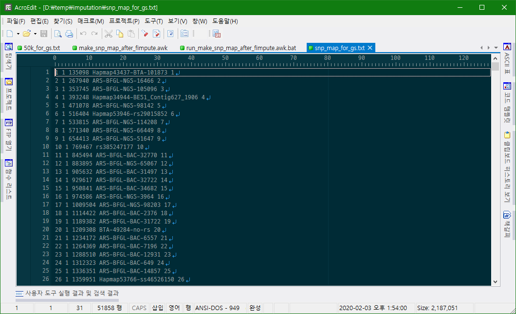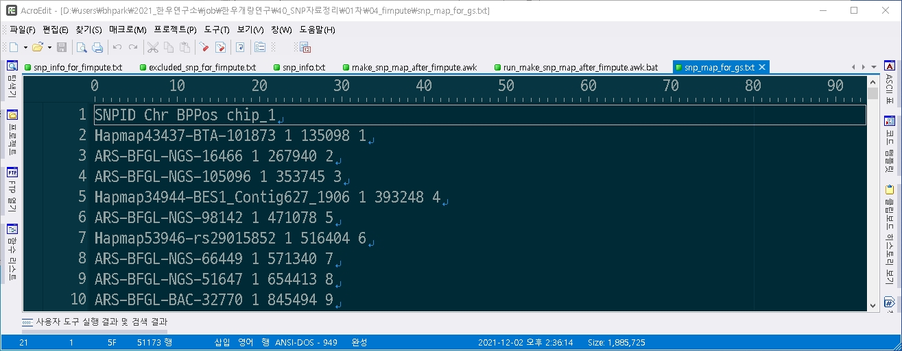output1 폴더의 snp_info.txt 파일을 재료로 하여 make_snp_map_after_fimpute.awk를 실행한다.윈도우 탐색기에서 run_make_snp_map_after_fimpute.awk.bat 을 더블 클릭하여 실행할 수 있다.