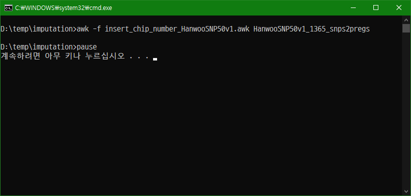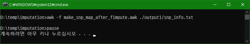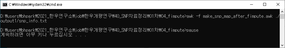 윈도우즈 탐색기에서 run_make_snp_map_after_fimpute.awk.bat 파일을 더블클릭하여 실행할 수 있다. 다음은 실행 화면이다.