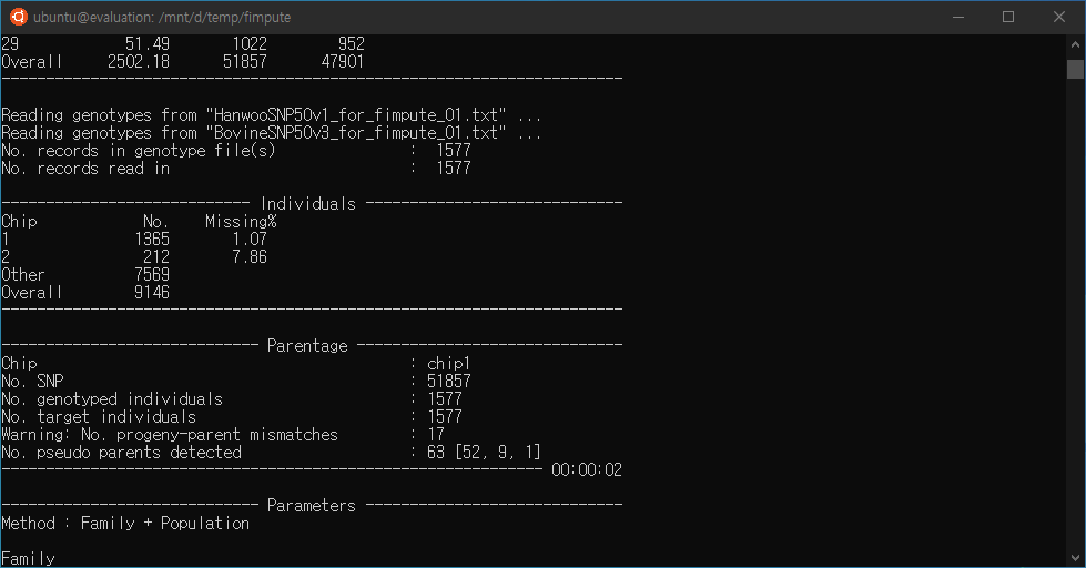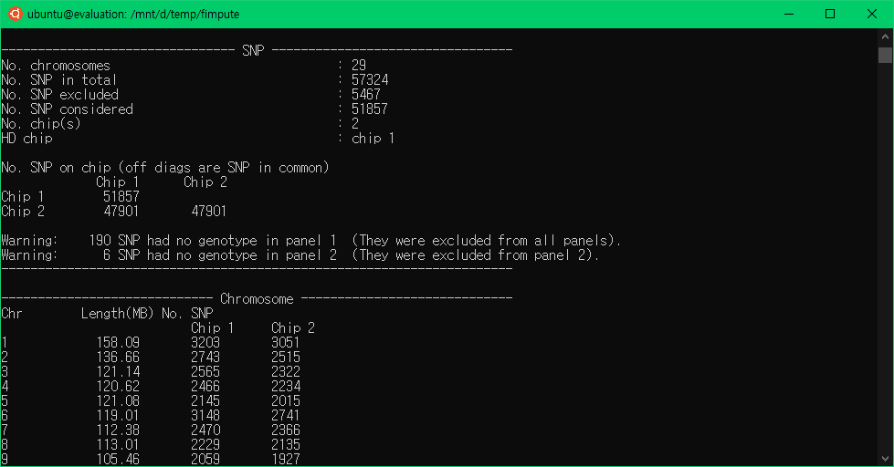 마지막으로 경험에서 우러나온 얘기 한 마디. snp_info 파일을 만들었으면 반드시 snp_info 파일이 잘 만들어졌는지 확인해야 한다. 확인하는 방법은 snp_id 가 unique한지, 각 칩의 index가 0을 제외하고 unique한지 보는 것이다. FImpute가 snp_info 파일이 이상하다고 프로그램이 중단되는데 그 에러 메시지가 그리 친절하지 않다. 에러 메시지를 보고 원인을 찾기 힘들다. 그럴 때 snp_id, 각 칩의 index가 unique한지 점검하기 바란다. 프로그램을 실행하기 전에 점검하는 것이 시간을 절약하는 길이다. (그러나 이렇게 얘기를 해도 점검하는 사람을 못 봤다. 결국 이해할 수 없는 프로그램 에러를 보고 몇날 며칠을 고민하다 점검한다. 나도 그렇다. 인간의 어리석음이란 ...)
