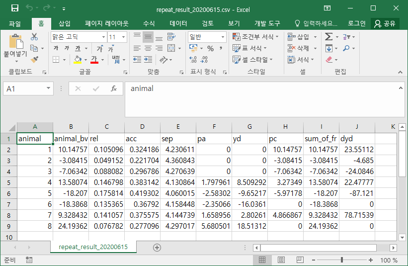 다음은 출력 파일을 엑셀에서 표시한 결과이다.