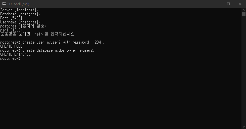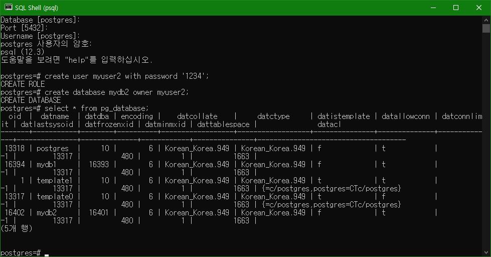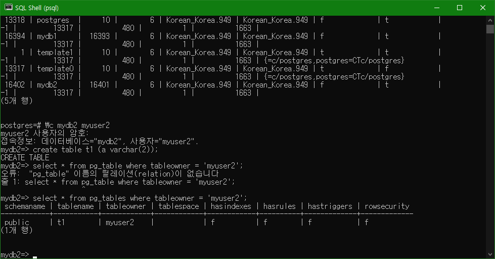 소유자가 myuser2인, mydb2 데이터베이스를 생성