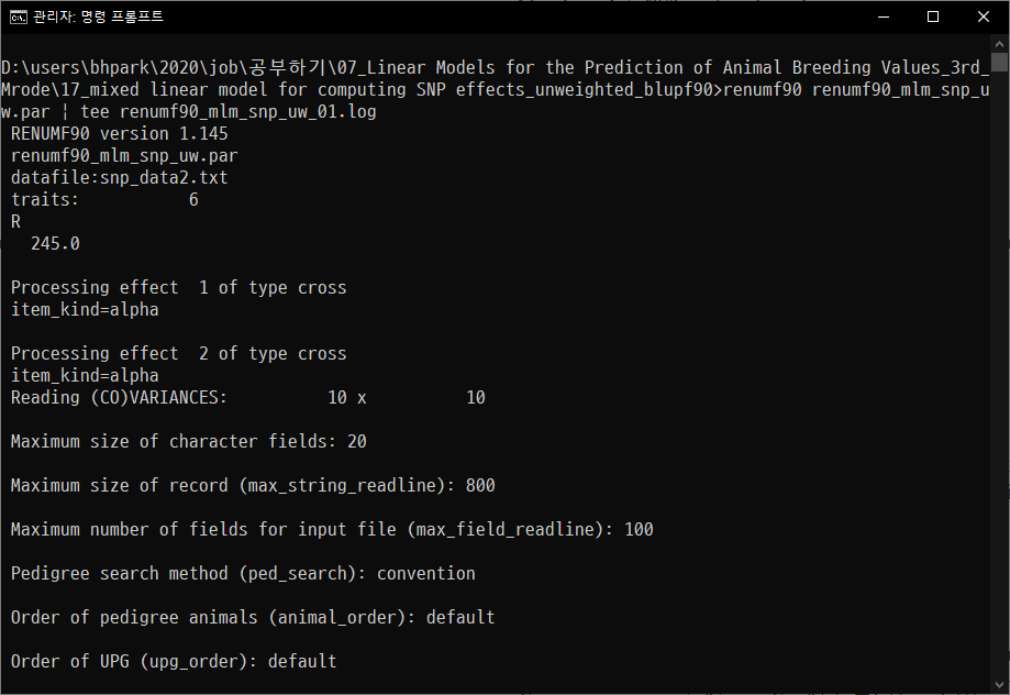 위에서 생성된 renf90.dat와 renf90.par를 이용하여 blupf90 실행