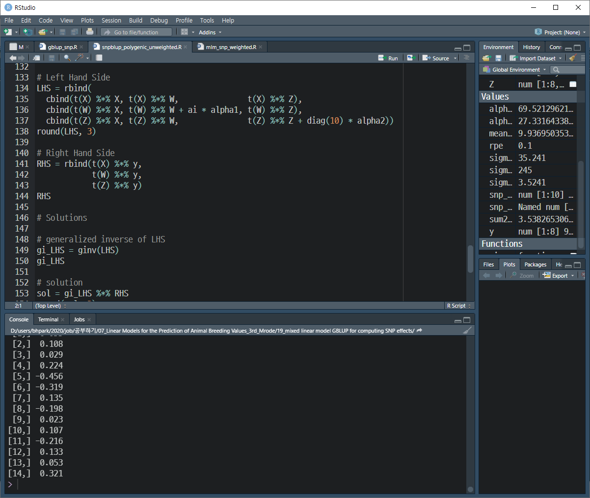 | Mixed Linear Model(SNP-BLUP Model) for Computing SNP Effects, unweighted analysis (0) | 2020.12.19 |