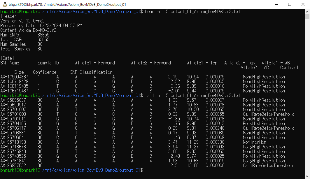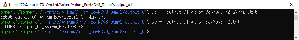 snp map 파일과 final report가 만들어 졌으면 잘 만들어 졌는지 확인해야 하는데 snp map 파일이야 5만에서 70만 행이므로 열어볼 수 있겠지만 final report가 3억 개의 행을 가지고 있다면 열어 보기가 쉽지 않다. 그럴 경우 Unix 명령어 head, tail, wc 등을 이용하여 확인하여야 한다.