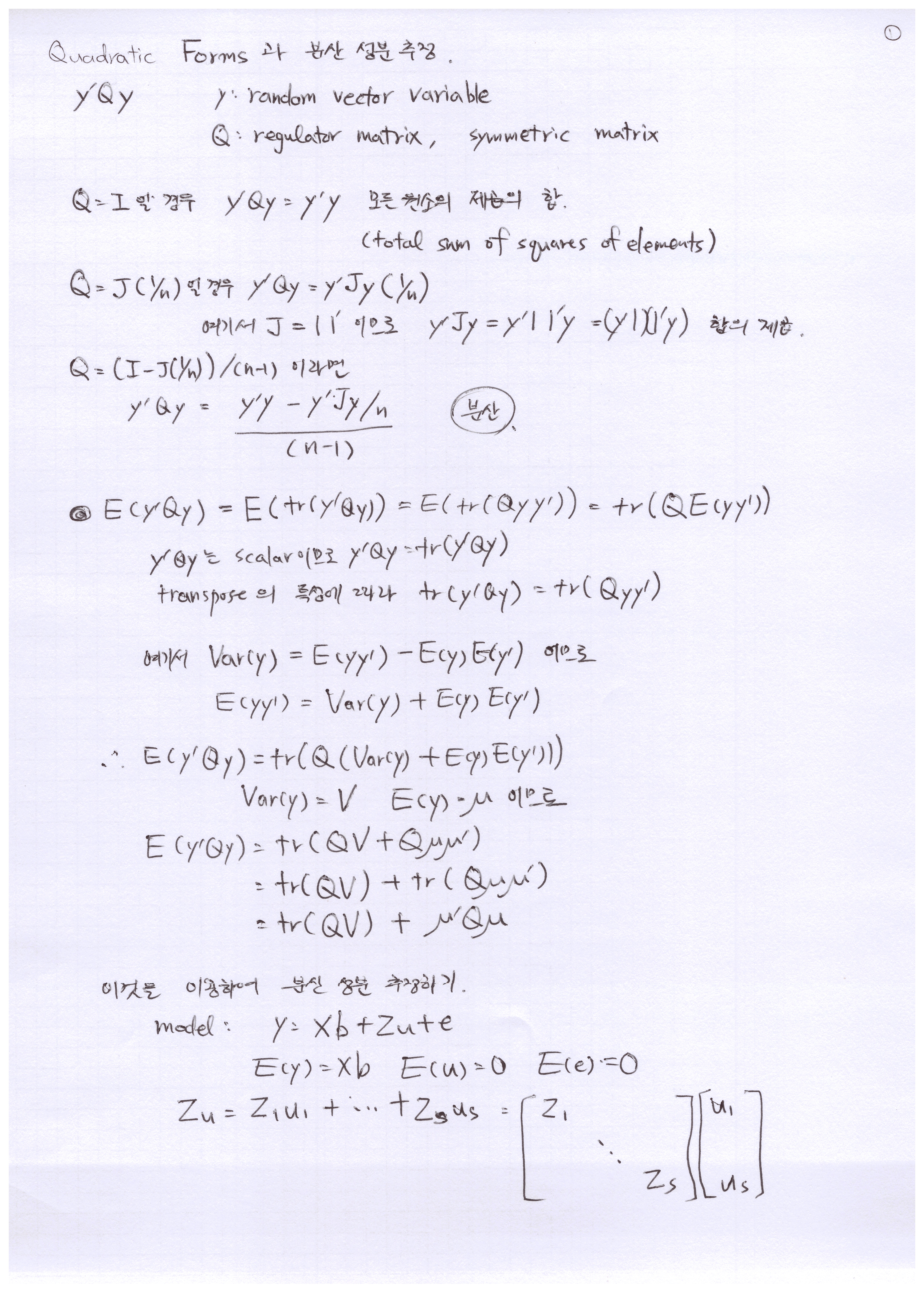 quadratic form(2차 형식) y’Qy 은 벡터들의 곱으로 스칼라값이 나오는 것을 말한다. 결과가 스칼라가 된다는 것이 중요하다. quadratic이라고 표현하는 것은 벡터 원소 2개의 곱의 형태로 나오기 때문인 것으로 보인다. Q는 square(정방 행렬)이고 symmetric(대칭)이다. quadratic form은 분산을 구할 때 등 다양한 상황에서 등장하고, 분산 성분을 추정할 때도 등장한다. y가 random variable vector이므로 y의 곱으로 나온 quadratic form도 random variable이다. 그래서 quadratic form의 expectation과 variance를 추정한다. 여기서는 분산을 구할 때 quadratic form이 어떻게 쓰이는지 보고, quadratic form의 expectation을 구하여 간단한 분산 성분을 추정하는 방법을 살펴 본다. 지금은 추억의 이름인 Henderson Method 1, 2, 3 또는 MIVQUE 등이 quadratic form을 이용한 분산 성분 추정 방법인 것으로 보인다. 아래 예에서도 나오지만 분산 성분을 추정하였는데 negative가 나온다. 제곱값이면 그럴 수 없는데. 그래서 이제는 잘 안쓰이나 보다.