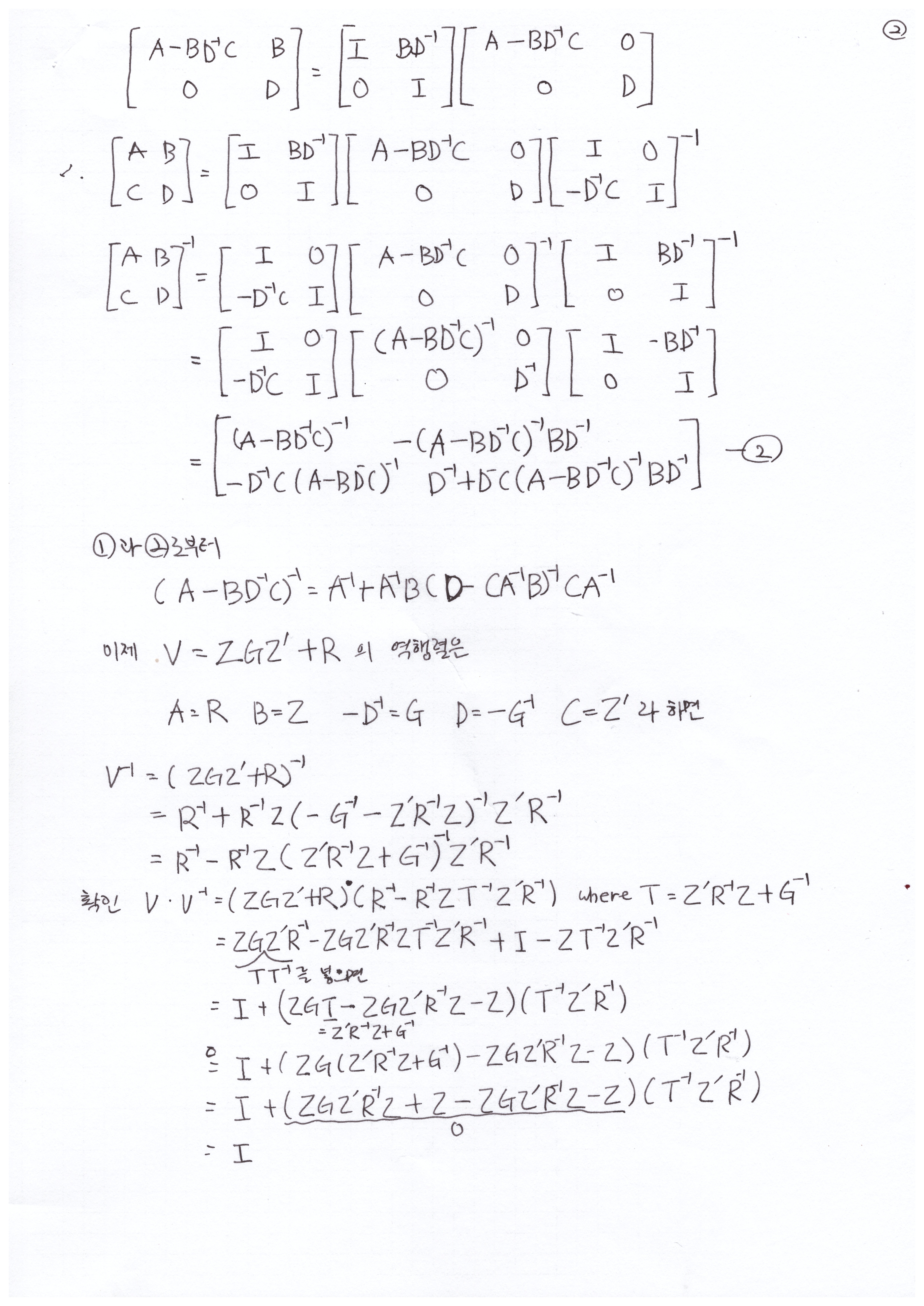 mixed model의 y의 분산-공분산 행렬 V = ZGZ’+R이다. V의 역행렬은 매우 복잡하다. 이걸 어떻게 유도하나 찾아보니 셔먼-모리슨-우드버리 공식(Sherman – Morrison – Woodbury formula)이란게 있었다. 이걸 가축육종학의 mixed model의 V의 역행렬에 적용한 것으로 보인다. 여기서는 셔먼-모리슨-우드버리 공식 유도를 따라가 보고, 결국 V의 역행렬이 셔먼-모리슨-우드버리 공식을 따르고 있다는 것을 보자.