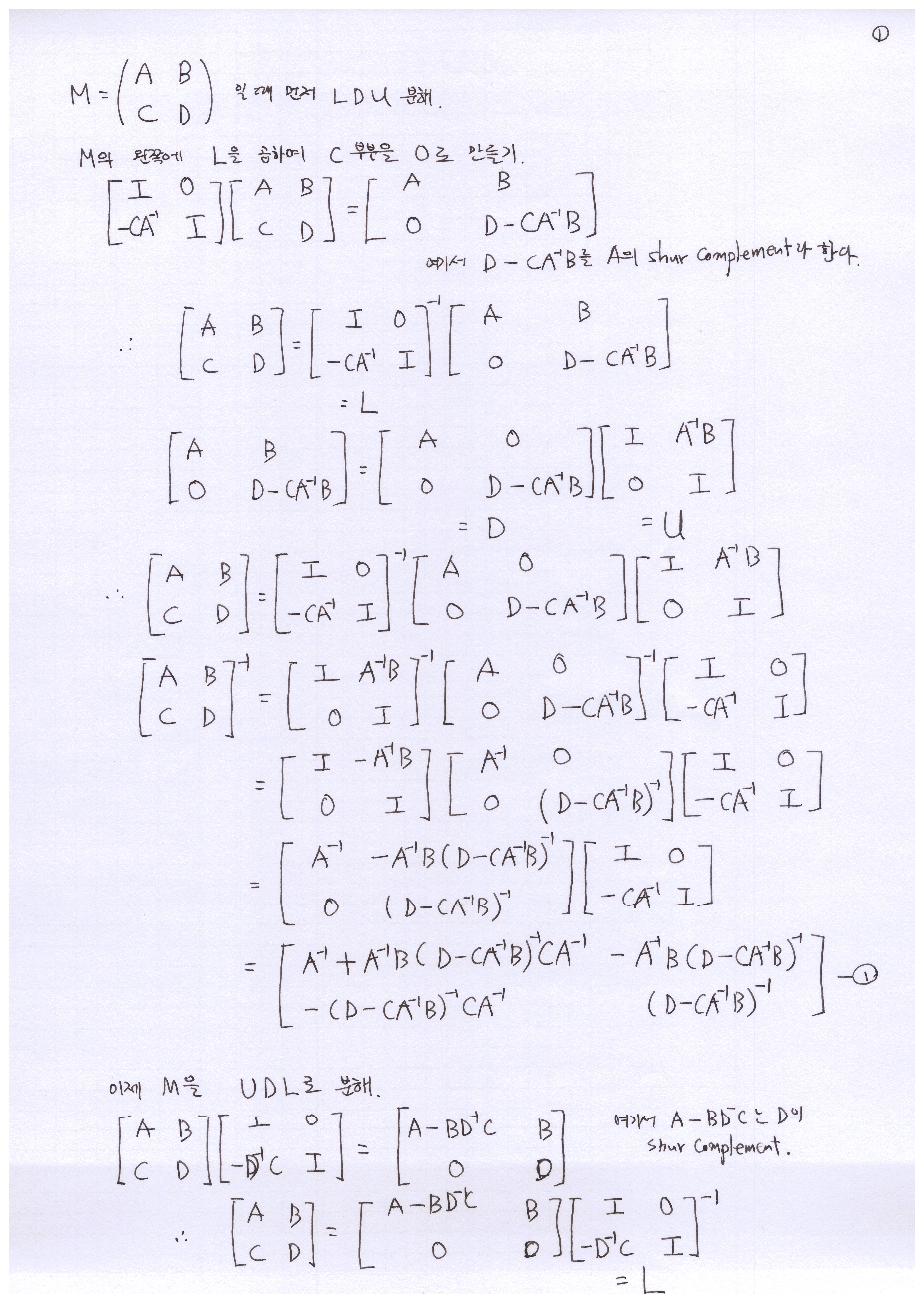 A, B, C 및 D 네 개의 부분 행렬로 이루어진 행렬을 LDU, UDL로 만들어 보고, 그것들의 역행렬을 구해볼 것이다. LDU는 하삼각(Lower), 대각(diagonal), 상삼각(Uppper) 행렬을 말한다.