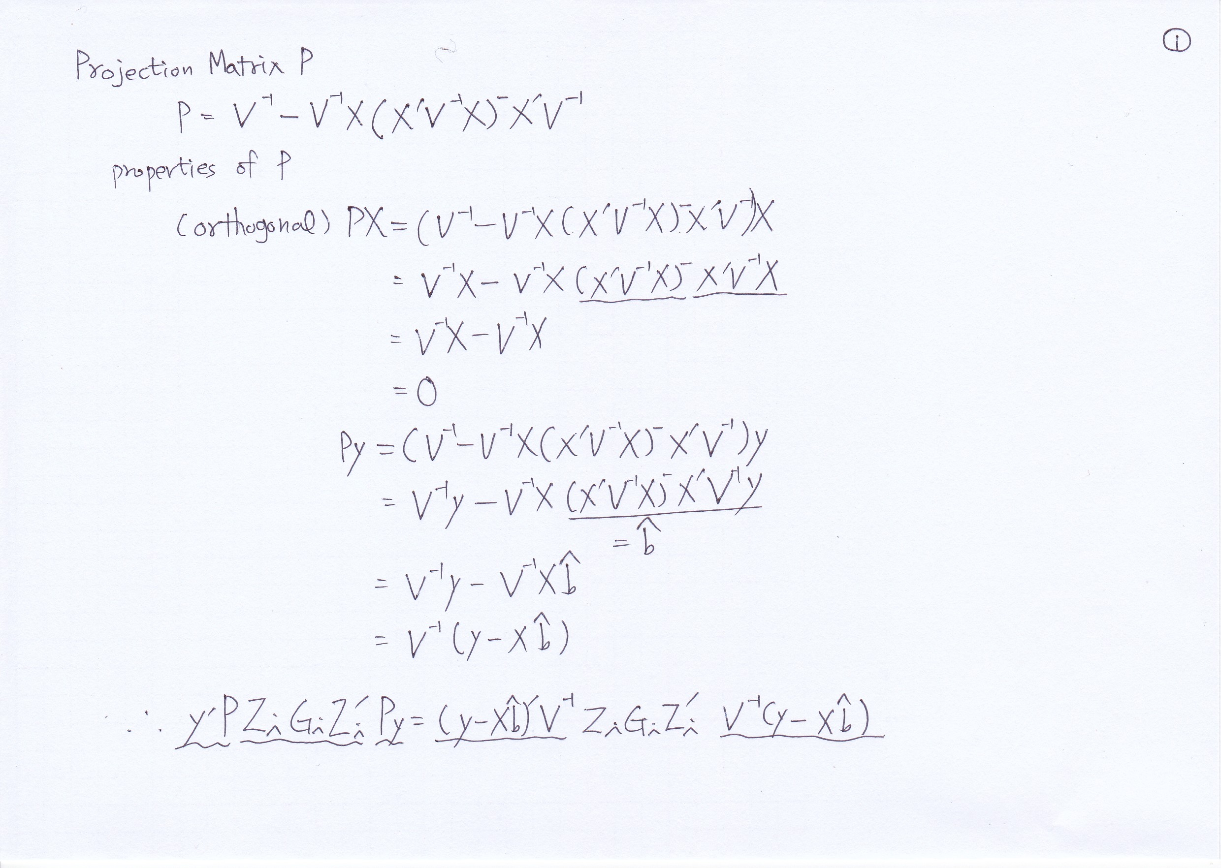 MME가 아니라 BLUP에서 b^hat은 = (X'V-1X)-1X'V-1y 였다. 그러므로 X의 영향을 제거한 잔차 e^hat = y - X( (X'V-1X)-1X'V-1y = (I - X(X'V-1X)-1X'V-1)y 이고, 여기서 P = I - X(X'V-1X)-1X'V-1 인데, V의 역행렬 V-1을 가중치로 주어 최종적인 Projection matrix P = V-1 - V-1X(X'V-1X)-1X'V-1 이다. 이 Project matrix도 orthogonal해서 PX = 0이다. 나중에 분산 성분 추정할 때 P를 어디서 사용하는지 살펴보자.
