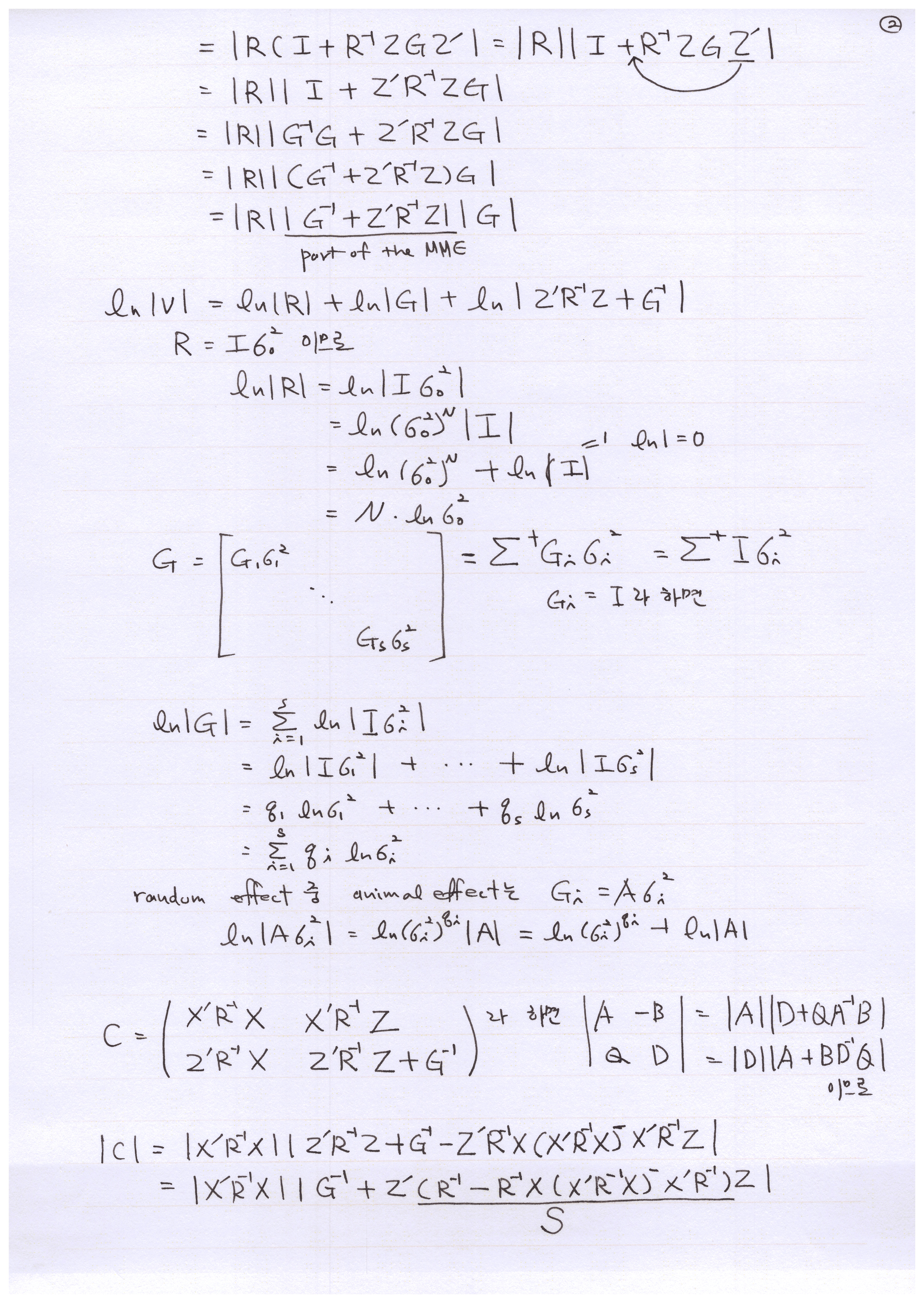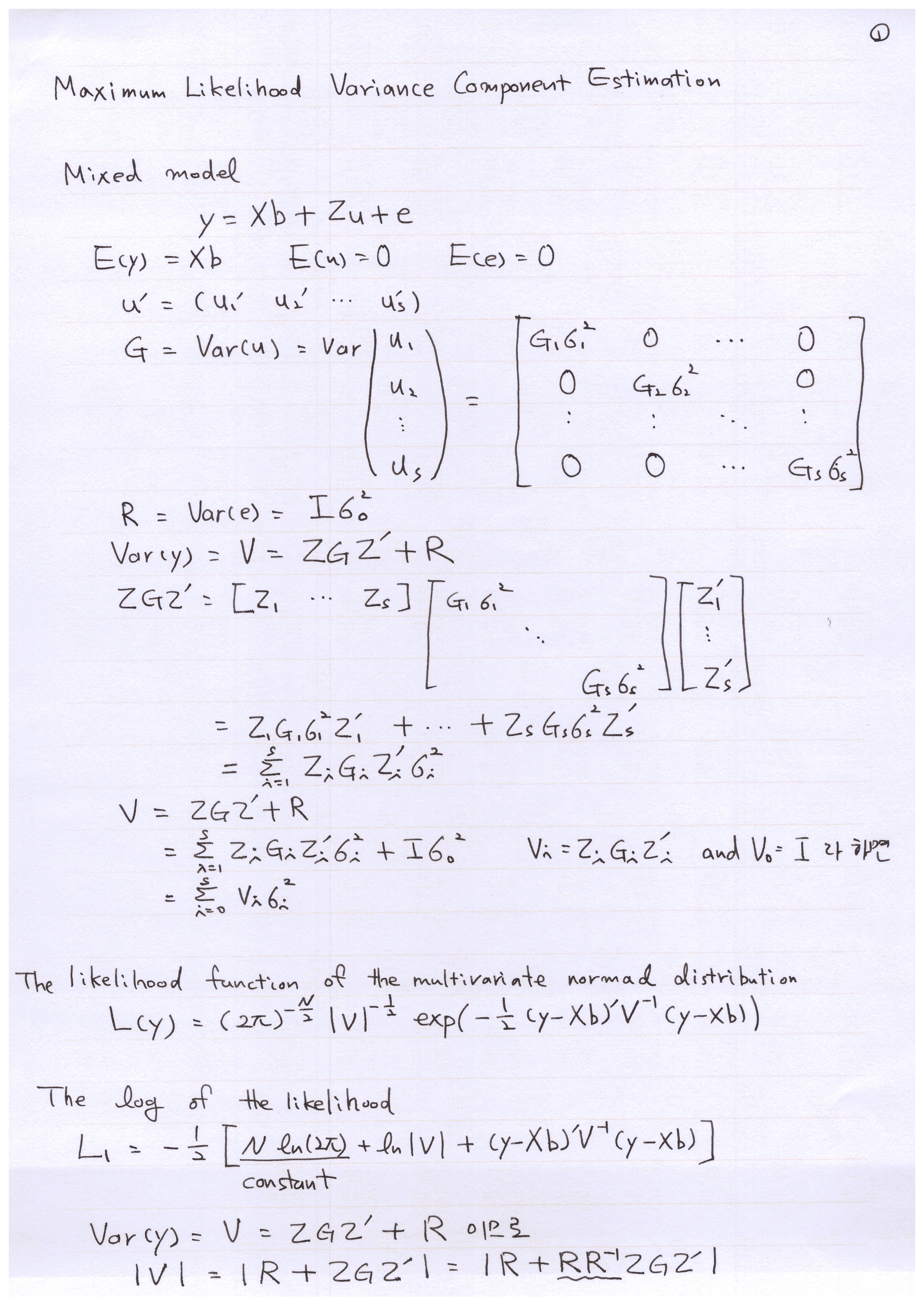 이제 혼합 모형에서 임의 효과의 분산 성분을 구하는 것을 해 보자. 그런데 이전보다 먼저 이해해야 할 것이 참 많다. 다변량 정규 분포 함수나 다변량 우도 함수(likelihood function), 혼합 모형 관측치의 분산-공분산 행렬과 그 역행렬, 공분산 행렬과 MME의 계수 행렬의 행렬식, 투영 행렬(Projection matrix), 그리고 우도 함수의 로그를 취하여 미분하기, 그에 따른 V와 V의 역행렬의 미분, 행렬식의 로그값의 미분, P의 미분, Z'ZTZ'Z의 trace의 변형 등을 먼저 이해하여야 한다. 각각을 간단히 다룬 포스트가 있으므로 미리 공부하면 좋을 것 같다.