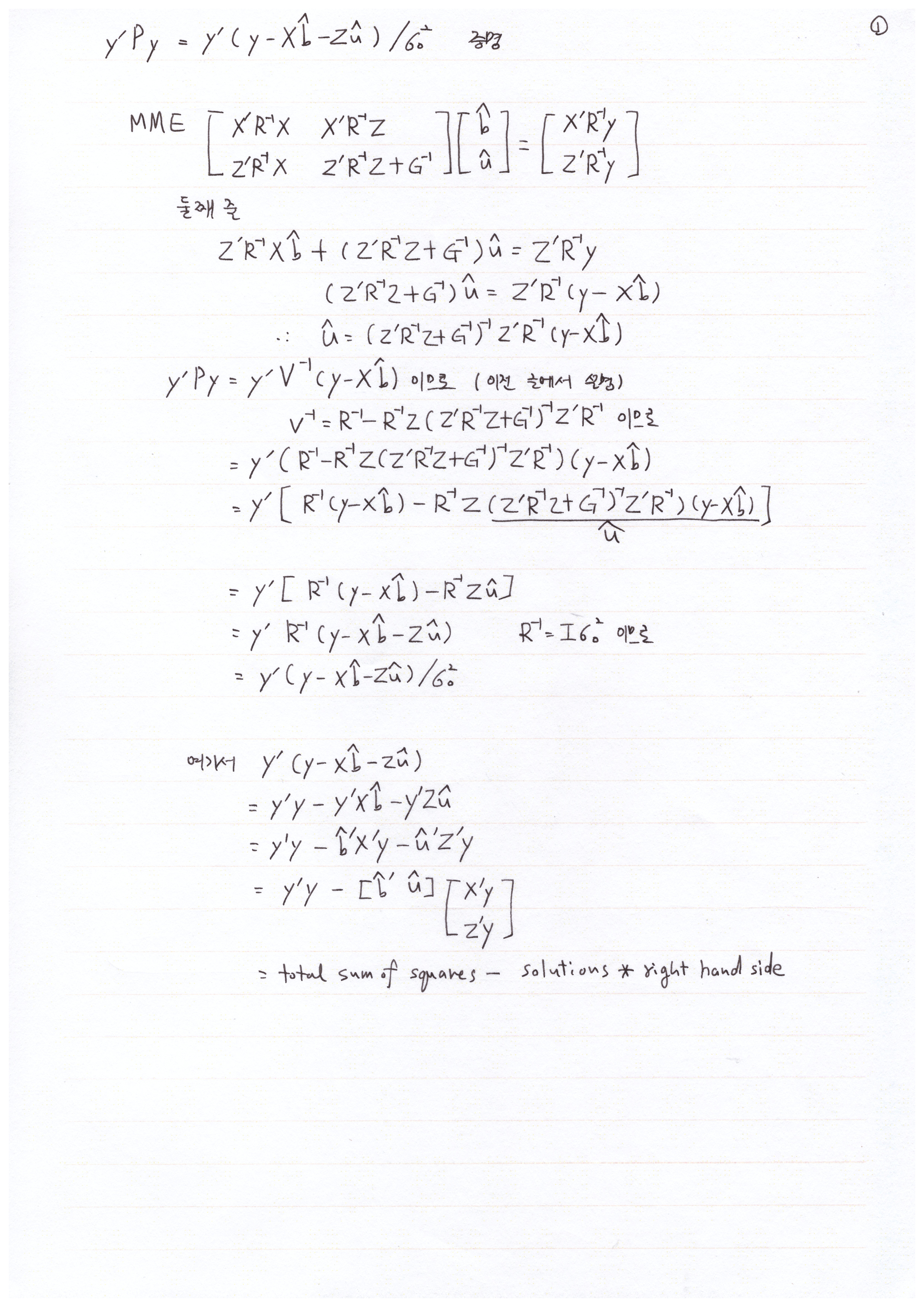 우도 함수의 여러 가지 변형 형태에 대해서 얘기했었다. 우도함수의 마지막 항 y'K'(K'VK)-1K'y = y'Py = (y - Xb^)' V-1 ( y - Xb^) 임을 설명하였다. 여기서는 또 다른 변형 형태에 대해서 설명하고 어떻게 적용하는지 알아보자.