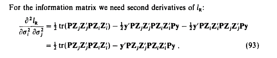 그러나 계산을 위해서 경우를 나누어 보면 약간 복잡해 진다. 분산을 효과의 분산과 잔차의 분산으로 나누어 본다면 1) 효과의 분산 - 효과의 분산으로 미분 2) 효과의 분산 - 잔차 분산으로 미분 3) 잔차 분산 - 잔차 분산으로 미분하는 경우로 나누어 볼 수 있다. 그래서 Gilmour의 Average Information REML An Efficient Algorithm for Variance Parameter Estimation in Linear Mixed Models 논문에서는 다음과 같이 2차 미분한 식을 다음과 같이 표현하고 있다.